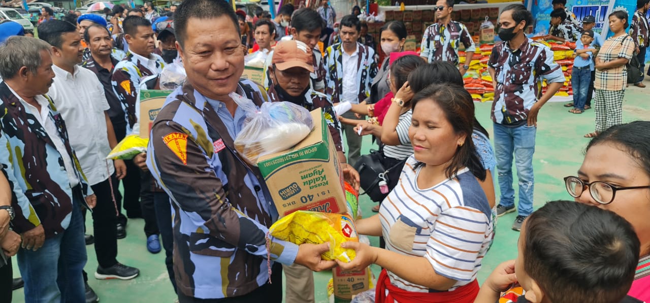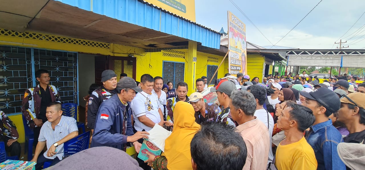 Dewan Pimpinan Daerah (DPD) Ikatan Pemuda Karya (IPK) Provinsi Riau bersama pengurus IPK Kabupaten Pelalawan membagikan ratusan paket sembako kepada masyarakat kurang mampu, Minggu.