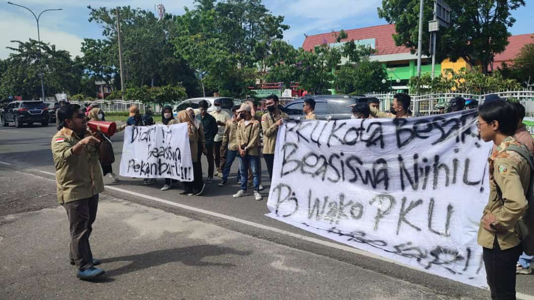 Dari orasinya, Defal Wiguna menyuarakan meminta kepada anggota Dewan Perwakilan Rakyat Daerah (DPRD) Kota Pekanbaru untuk menganggarkan beasiswa pendidikan.