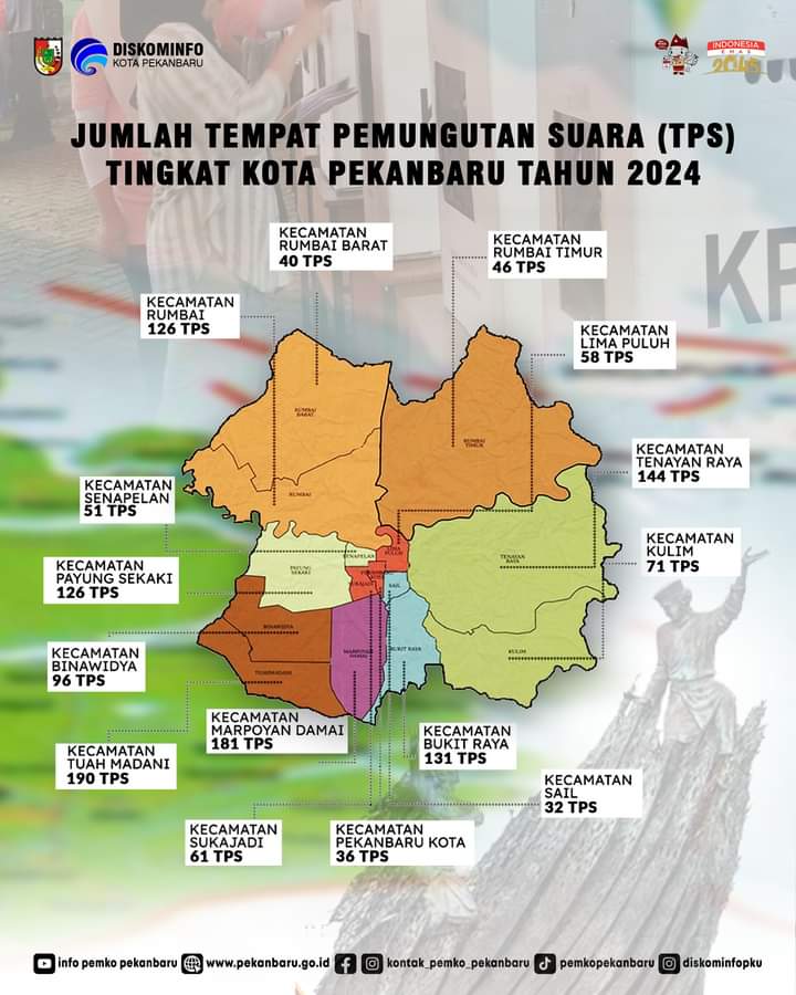 Saat ini sudah ada jumlah TPS yang tersebar di seluruh 15 kecamatan di Kota Pekanbaru. Pemilu 2024 ini siap memfasilitasi hak suara masyarakat Kota Pekanbaru.
